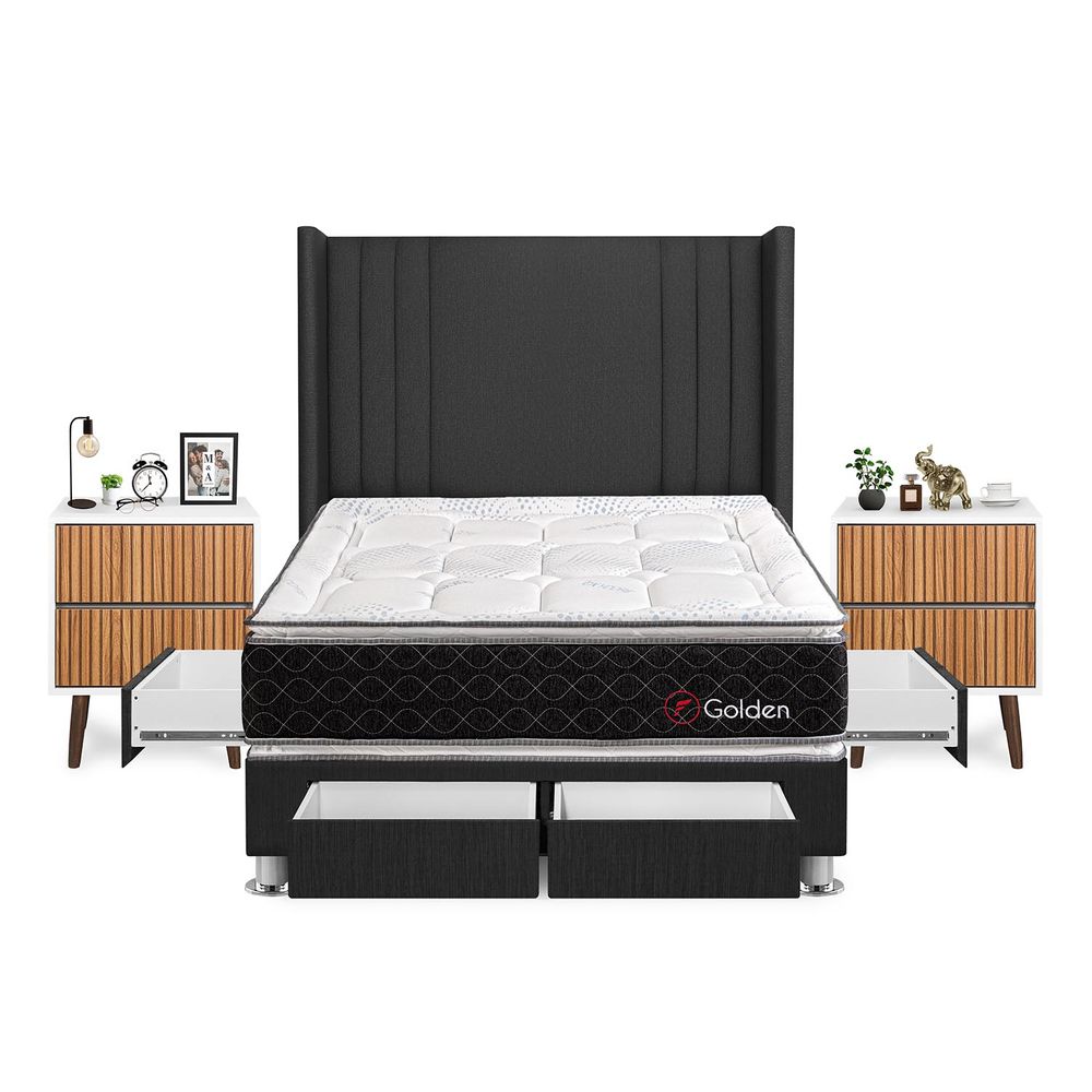 Dormitorio Golden Con 4 Cajones 2 Plazas + Velador Milan + Respaldo GrisS/1,934