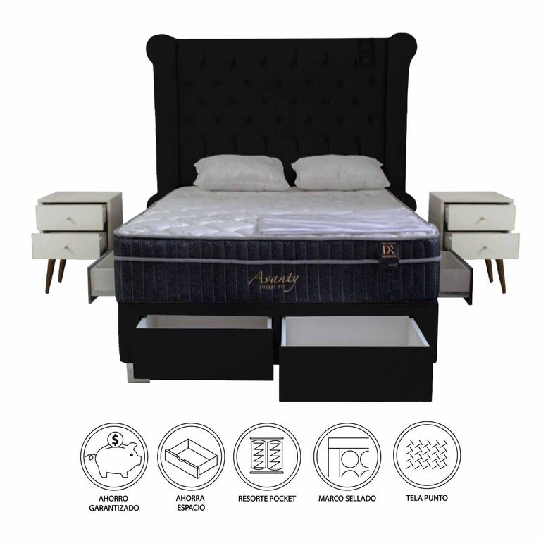 Dormitorio Pocket VIP 4 Cajones 2 Plz + Cabecera + 2 Veladores - Negro BARAKA HOMES/2,499