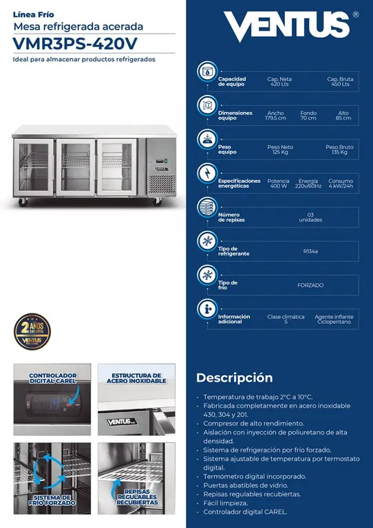 Mesa Refrigerada Acerada con 3 puertas de Vidrio, VMR3PS-420V - Ventus VENTUSS/6,199